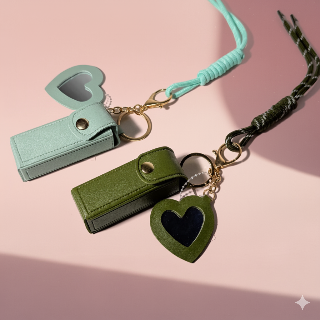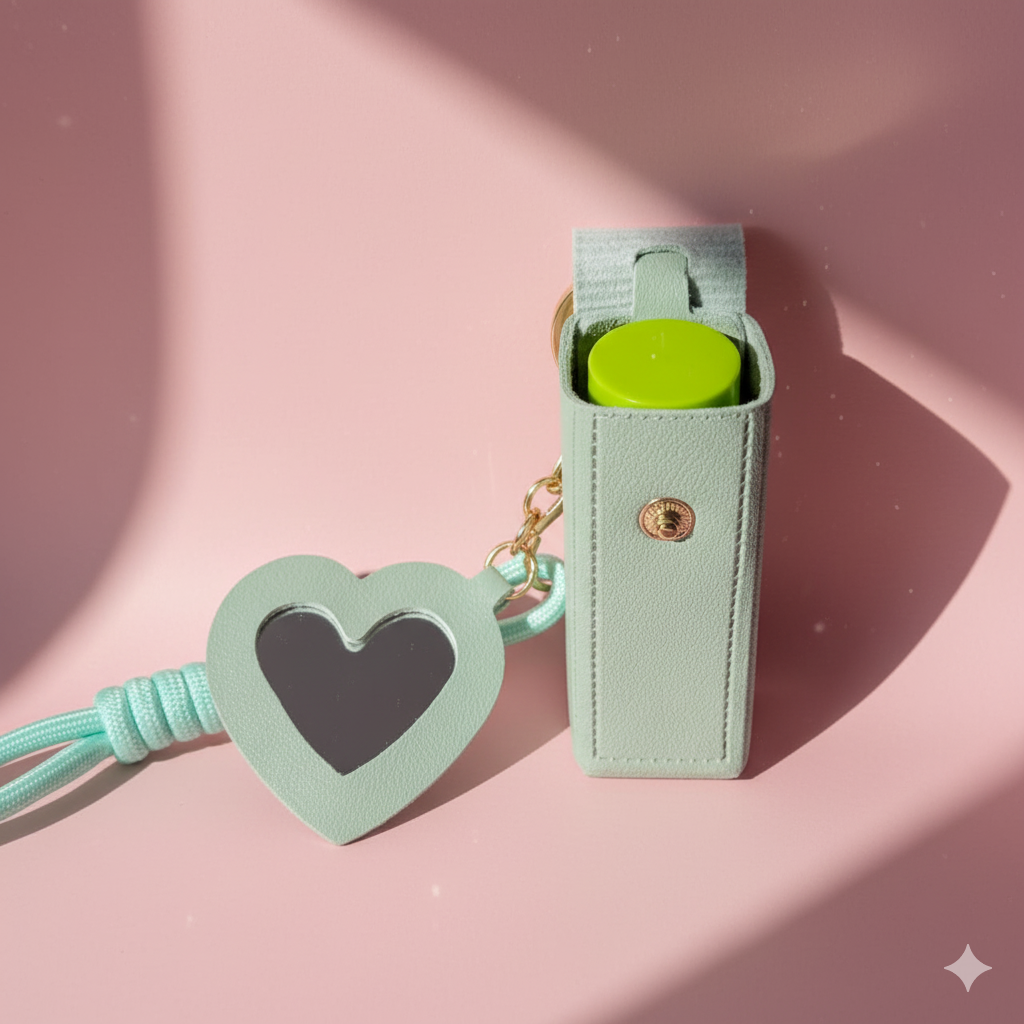 Llevá tu labial favorito a todas partes sin sacrificar estilo ni funcionalidad. Este llavero porta‑labial con espejo es el aliado perfecto para tus retoques rápidos: práctico, compacto y súper chic.